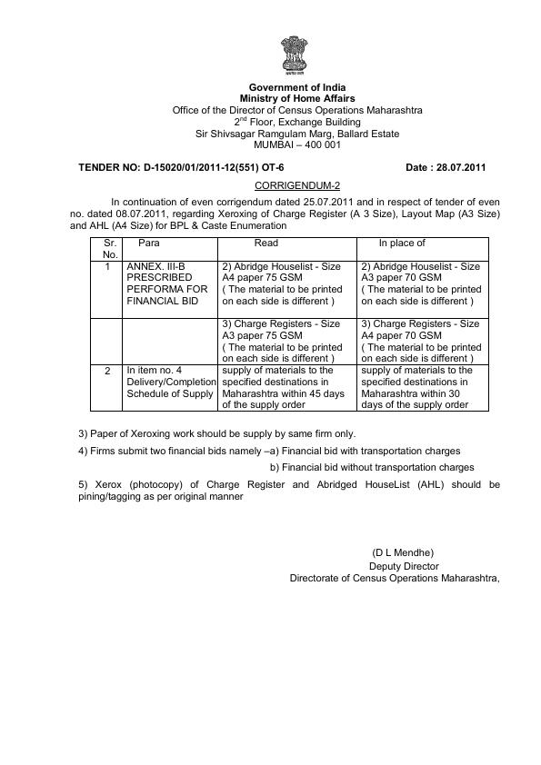 Corrigendum-2 to Tender Notice No D-15020/01/2011-12(551) OT-6 dated 08-07-2011 (DCO-Maharashtra )