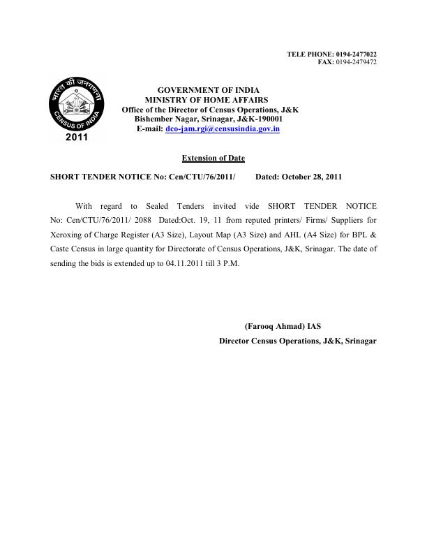 Corrigendum to Tender Notice No. Cen/CTU/76/2011/ 2088 Dated: Oct. 19, 11 (DCO - Jammu & Kashmir)