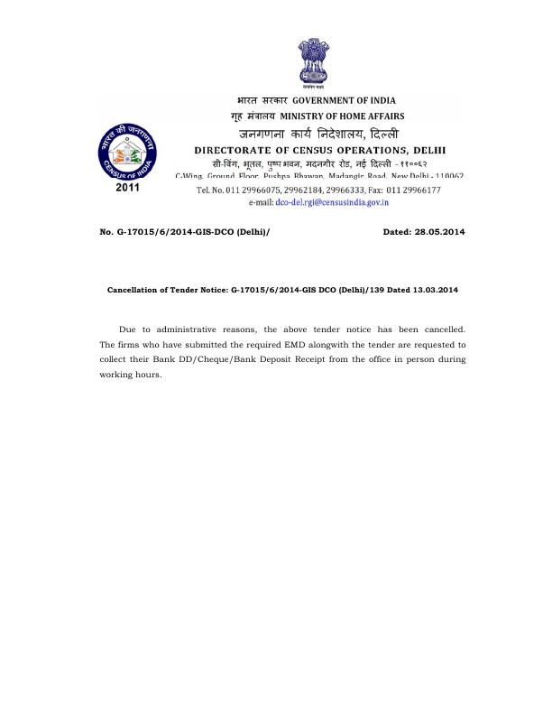 Cancellation of Tender Notice: G-17015/6/2014-GIS DCO (Delhi)/139 Dated 13.03.2014 [DCO- Delhi]