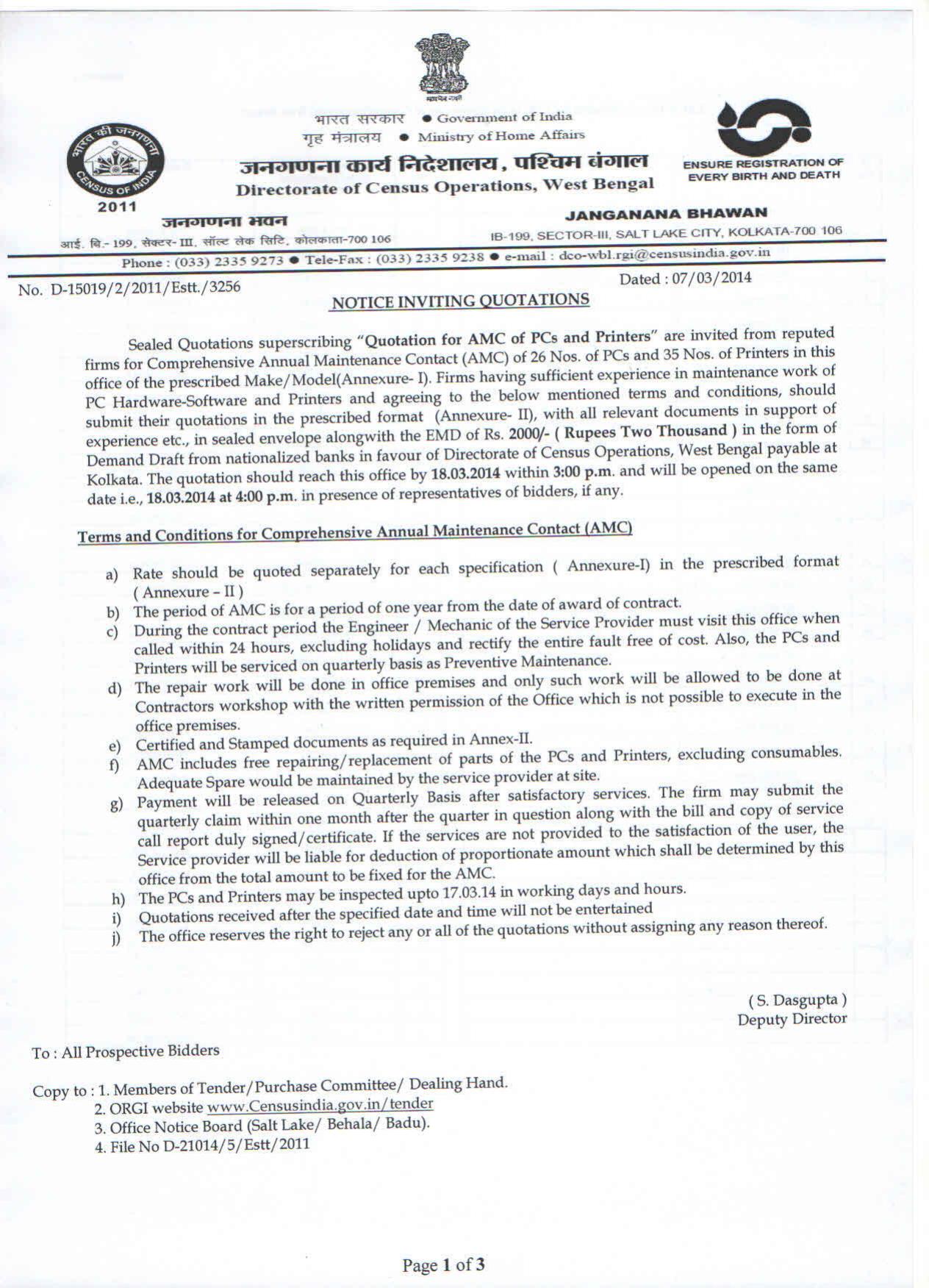 Tender for AMC of PCs and Printers [DCO- West Bengal]
