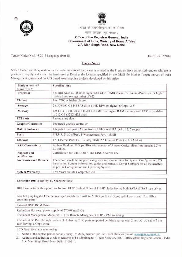 Tender Notice for MTSI Server [ORGI-New Delhi]