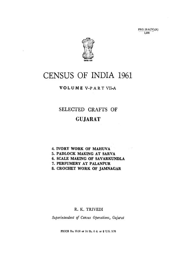 Selected Crafts of, 4, Ivory work of Mahuva, 5 Padlock Making at Sarva, 6 Scale Making of Savarkundla, Perfumery at Palanpur, 8 Crochet work of Jamnagar, Part VII-A, Vol-V - Census 1961
