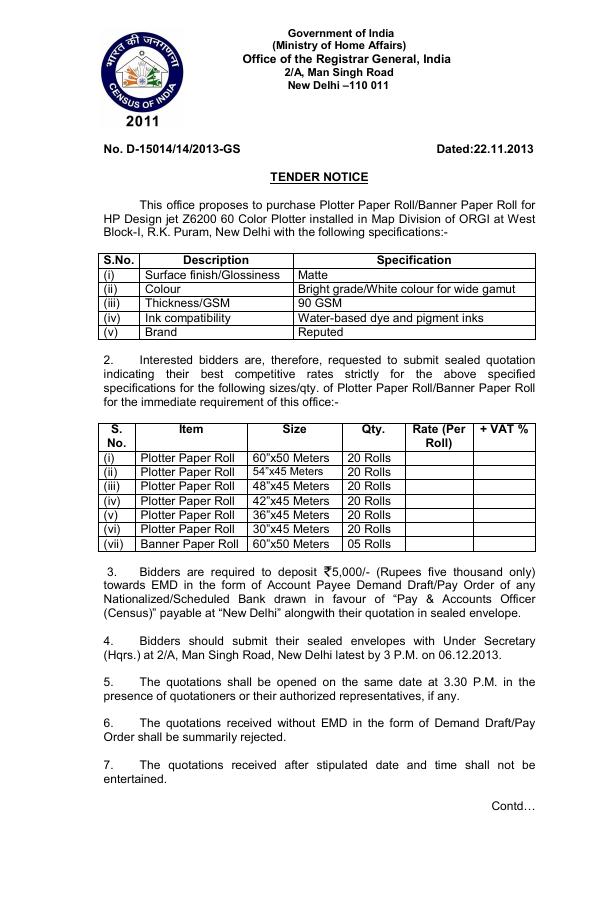 Tender for Plotter Paper Roll/Banner Paper Roll [ORGI-New Delhi]