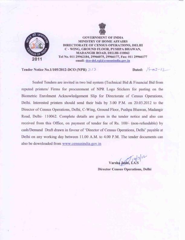 Procurement of NPR Logo Stickers for pasting on the Biometric Enrolment Acknowledgement Slip (DCO - Delhi)