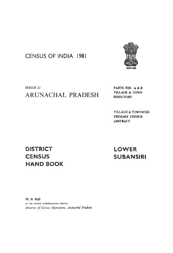 District Census Handbook, Lower Subansiri, Parts XIII-A & B, Series-25, Arunachal Pradesh - Census 1981