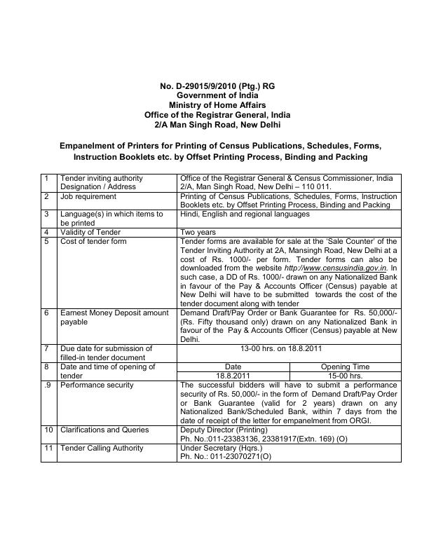 Empanelment of Printers for Printing of Census Publications, Schedules, Forms, Instruction Booklets etc. by Offset Printing Process, Binding and Packing (ORGI, New Delhi)