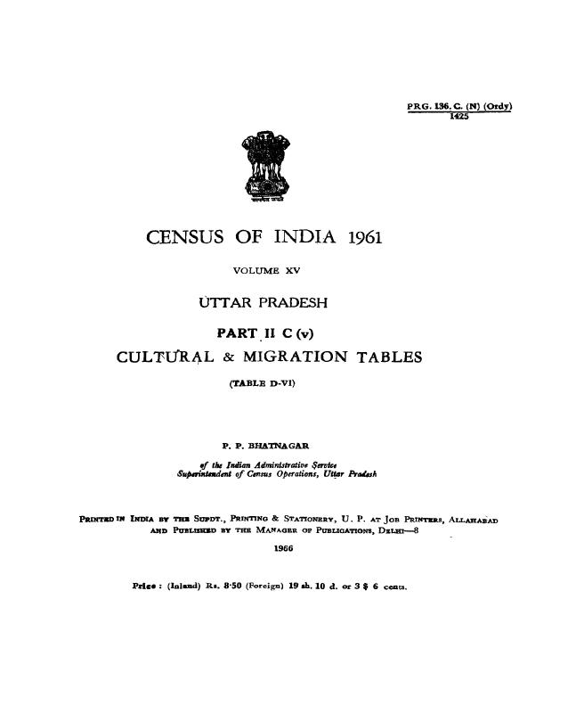 Cultural & Migration Tables, Part II C (v), Vol-XV, Uttar Pradesh - Census 1961