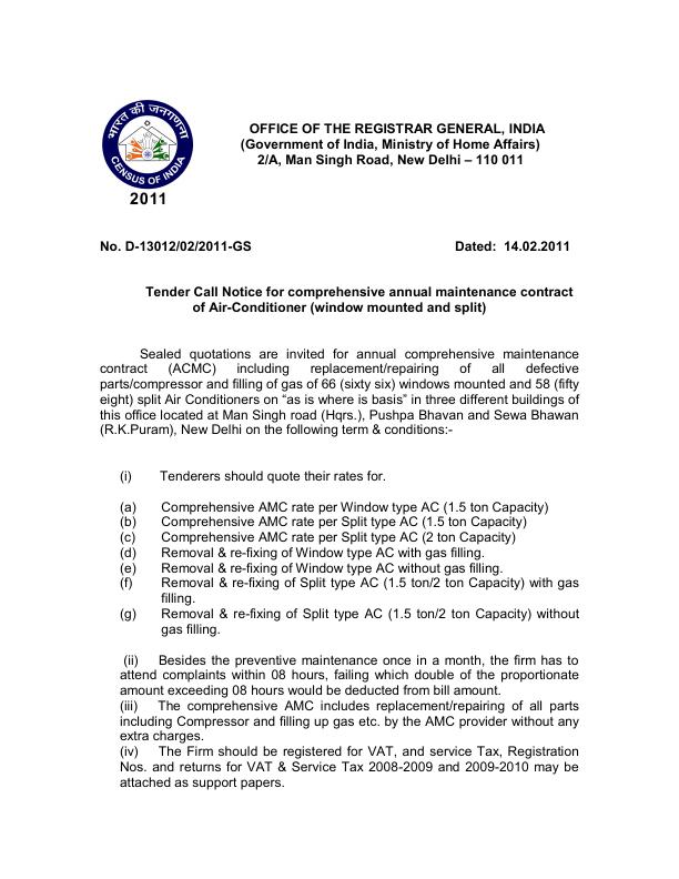 Tender Call Notice for comprehensive annual maintenance contract of Air-Conditioner (window mounted and split) ( ORGI - New Delhi)