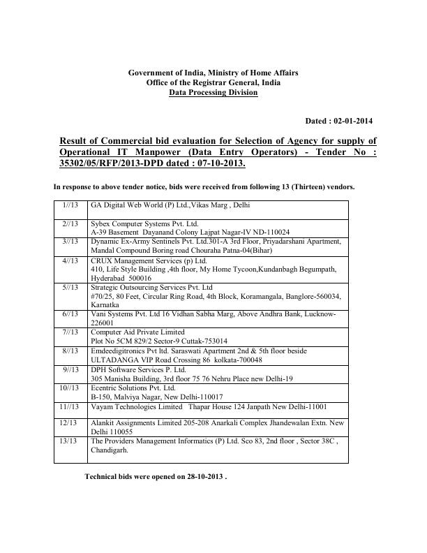Result of Commercial bid evaluation for Selection of Agency for supply of Operational IT Manpower (Data Entry Operators) - Tender No : 35302/05/RFP/2013-DPD dated : 07-10-2013.
