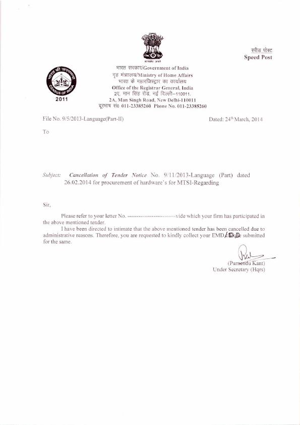 Cancellation of Tender Notice No. 9/11/2013- Language (Part) dated 26.02.2014 for procurement of hardware's for MTSI [ORGI-New Delhi]