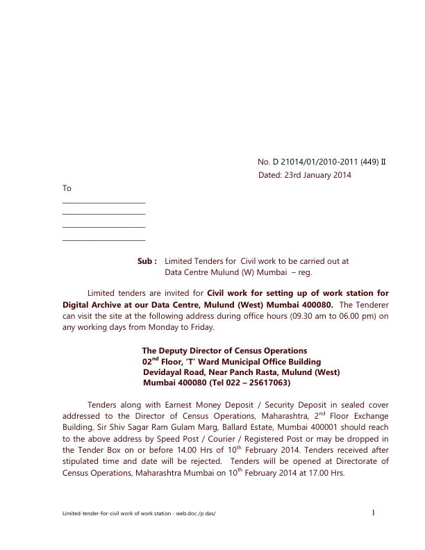 Tender for Civil work for setting up of work station for Digital Archive at our Data Centre, Mulund (West) Mumbai
