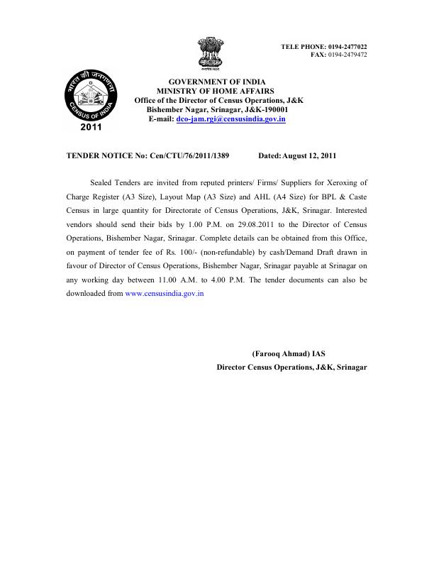 Tender for Xeroxing of Charge Register (A3 Size), Layout Map (A3 Size) and AHL (A4 Size) for BPL & Caste Census (DCO - Jammu & Kashmir)