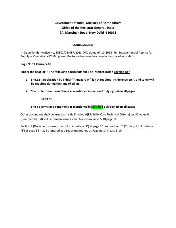 Corrigendum regarding Tender for Engagement of Agency for Supply of Operational IT Manpower [ORGI- New Delhi]