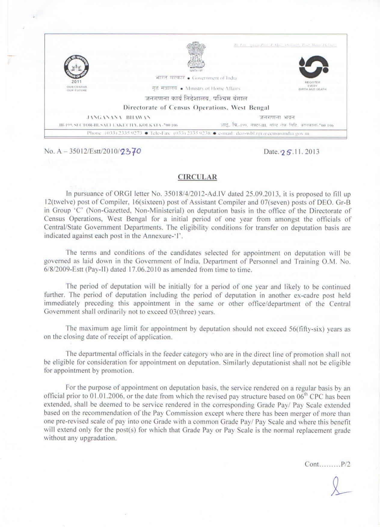 Selection for Appointmant on deputation basis in the Directorate of Census Operations West Bengal