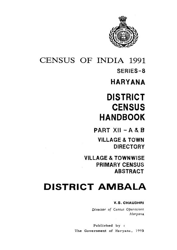 Village & Town wise Primary Census Abstract, Ambala, Part XII- A & B, Series-8, Haryana - Census 1991