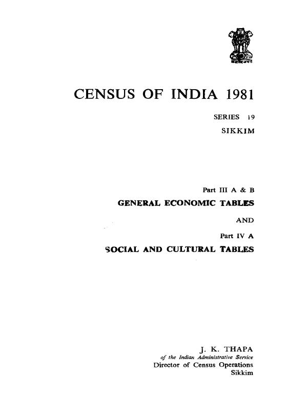 General Economic Tables and Social and Cultural Tables, Part-III-A and Part IV-A, Series-19, Sikkim - Census 1981