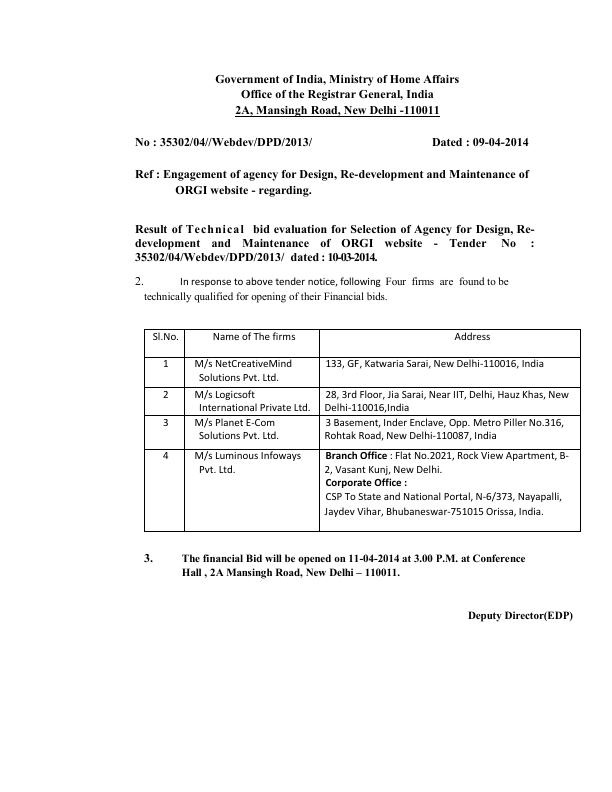 Result of Technical bid evaluation for Selection of Agency for Design, Redevelopment and Maintenance of ORGI website [ORGI - Nerw Delhi]