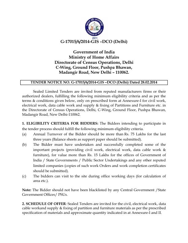Tender notice regarding Partition,Civil work, Data Cable work and Furniture [DCO- Delhi]