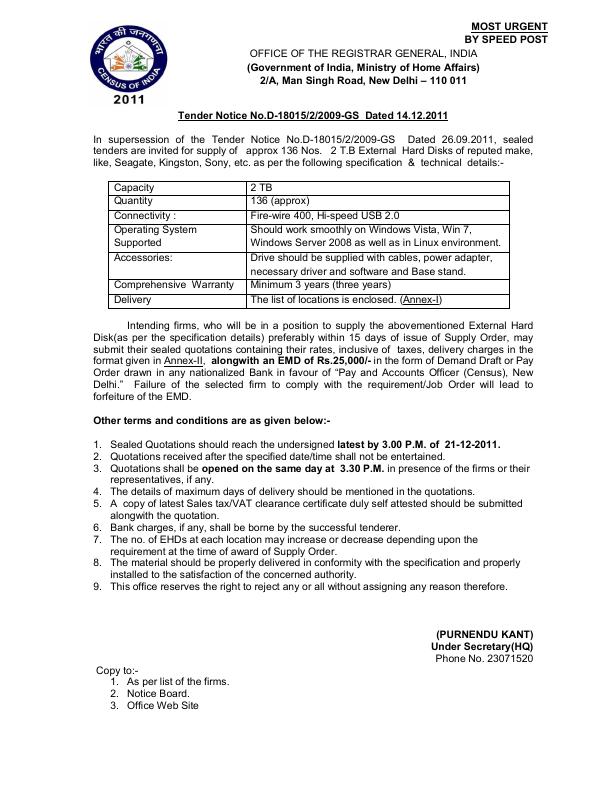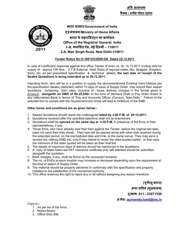 Extention of last date - Tender for procurement of 2.0 TB External Hard Drives (ORGI - New Delhi)