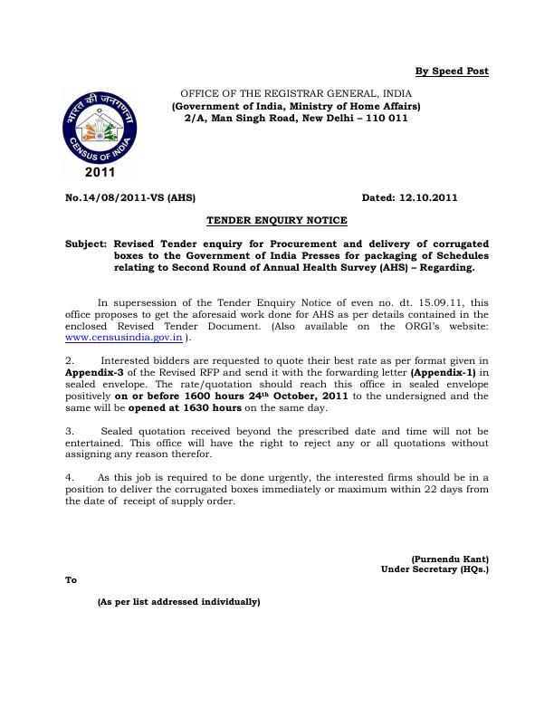 Revised Tender enquiry for Procurement and delivery of corrugated boxes to the Government of India Presses for packaging of Schedules relating to Second Round of Annual Health Survey (AHS) (ORGI - New Delhi)