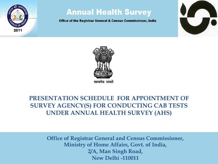 PRESENTATION SCHEDULE FOR APPOINTMENT OF SURVEY AGENCY(S) FOR CONDUCTING CAB TESTS UNDER ANNUAL HEALTH SURVEY (AHS) (ORGI, New Delhi)