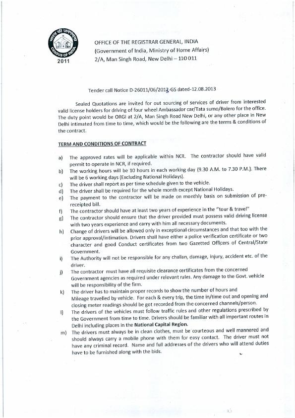 Tender for out sourcing of services of drivers