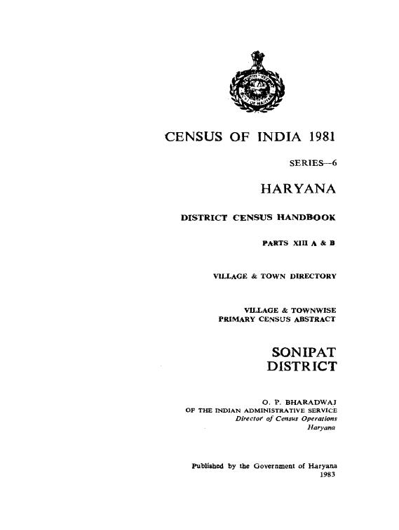 Village & Townwise Primary Census Abstract, Sonipat, Part XIII A & B, Series-6, Haryana - Census 1981