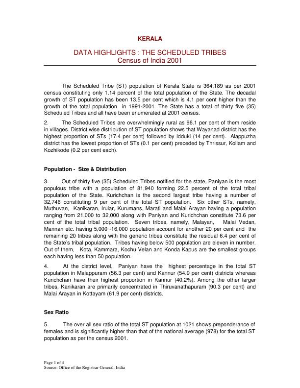 Census of India 2001, Data Highlights - The Scheduled Tribes, Kerala