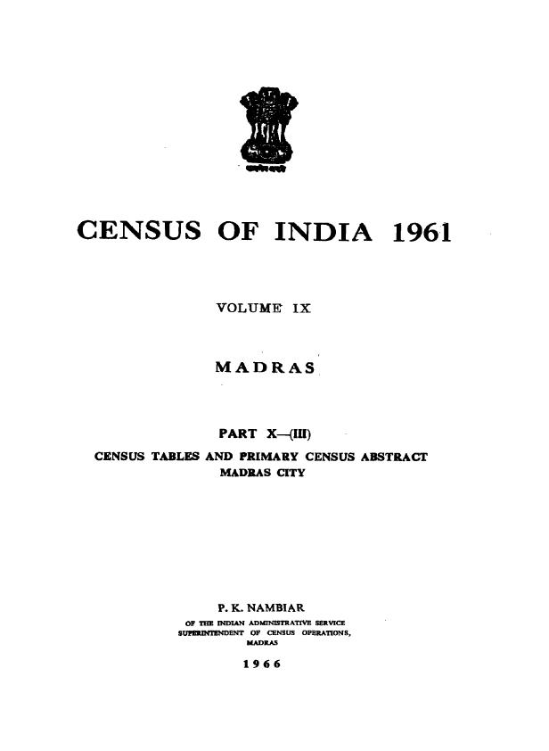Census Tables and Primary Census Abstract Madras City, Part X-(III), Vol-IX - Census 1961