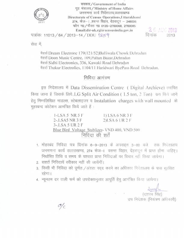 Quotation Notice for Procurment of LG(AC) for Establishment of Data Dissimenation Centre (Degital Archive) [DCO Uttrakhand]
