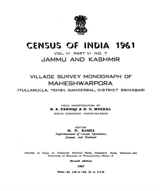 Village Survey Monograph of Maheshwarpora, Part VI-No-7, Vol-VI - Census 1961