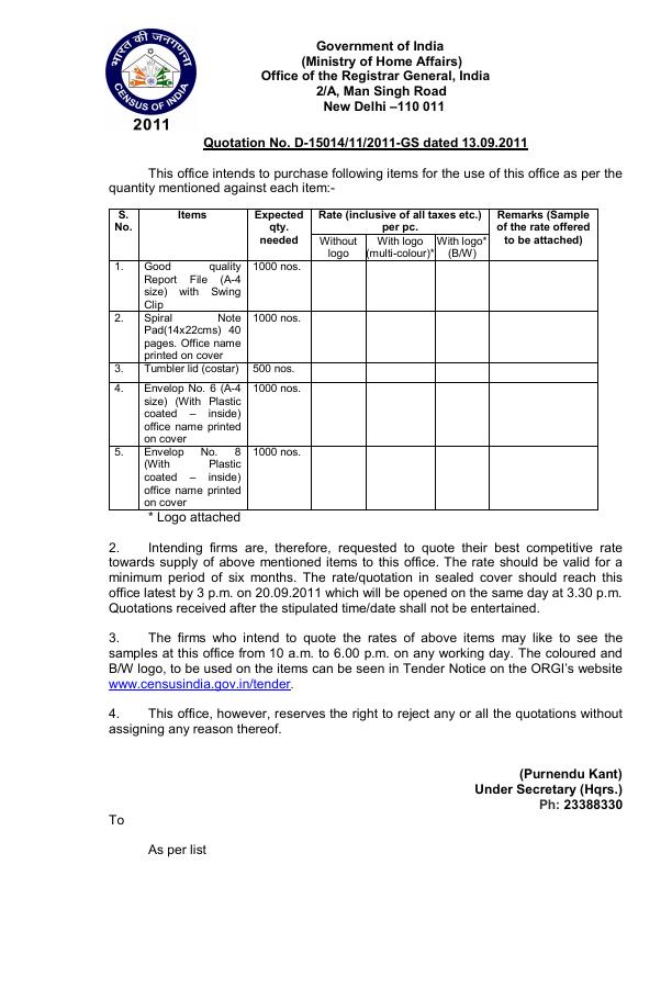 Tender for Procurement / Rate of items in office use for Resident Identity Card work (ORGI - New Delhi)