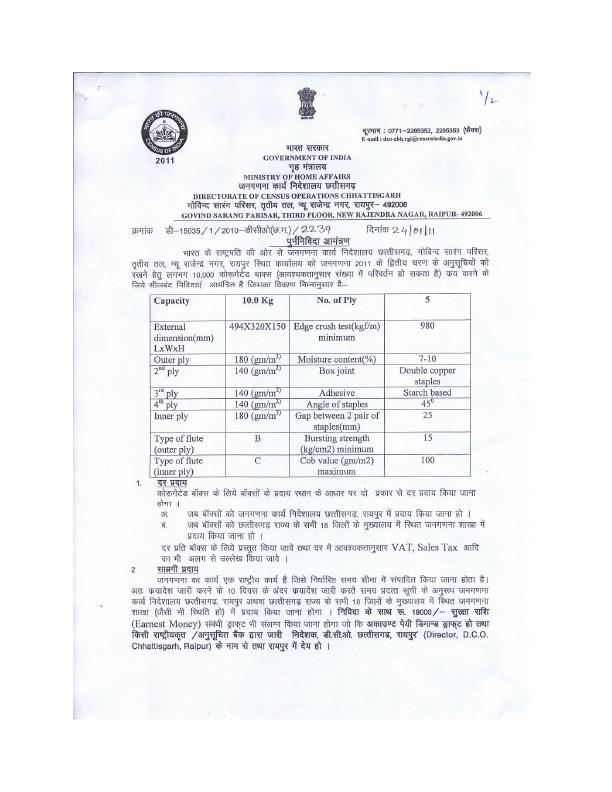 Re-Tender Call notice for purchase of Corrugated Boxes (DCO-Chhattisgarh)