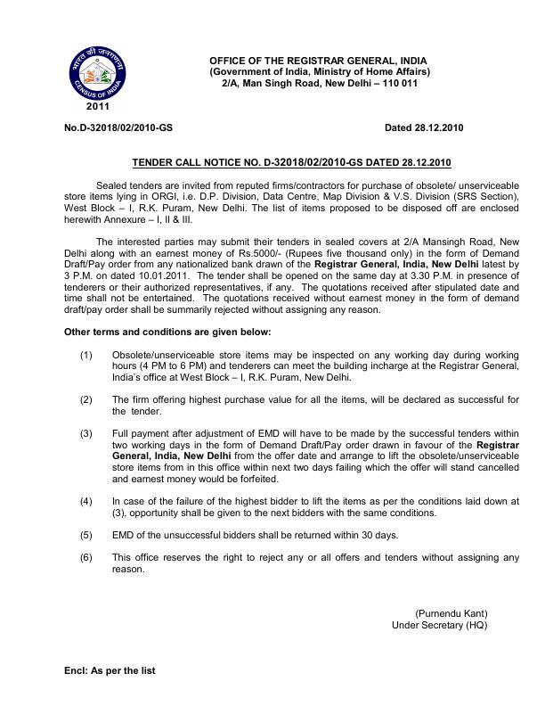 Tender for printing and supply of Acknowledgement Slip Booklets to be used for ongoing NPR Biometric Operations (DCO - West Bengal)