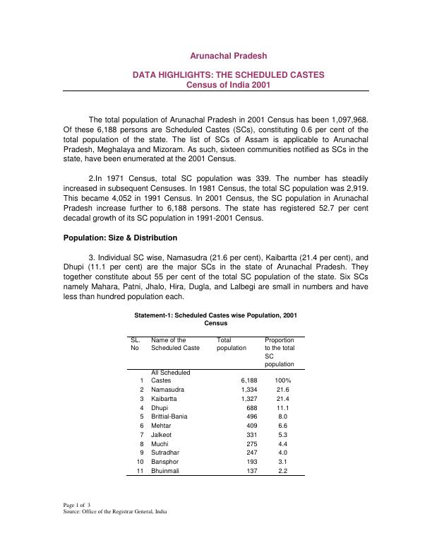 Census of India 2001, Data Highlights - The Scheduled Castes, Arunachal Pradesh