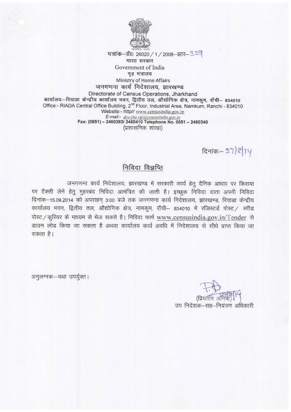Tender Paper for hiring of Taxi [DCO - Jharkhand]