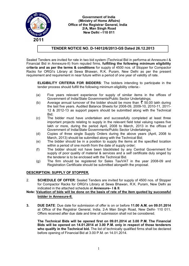 Tender for Stoppers for Compactors [ORGI-New Delhi]