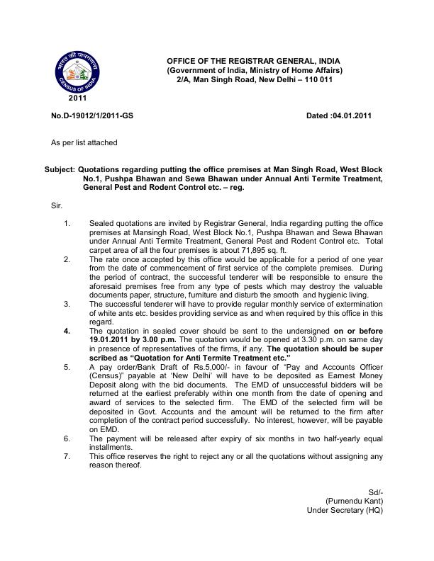 Quotations regarding putting the office premises under Annual Anti Termite Treatment, General Pest and Rodent Control etc (ORGI-New Delhi)