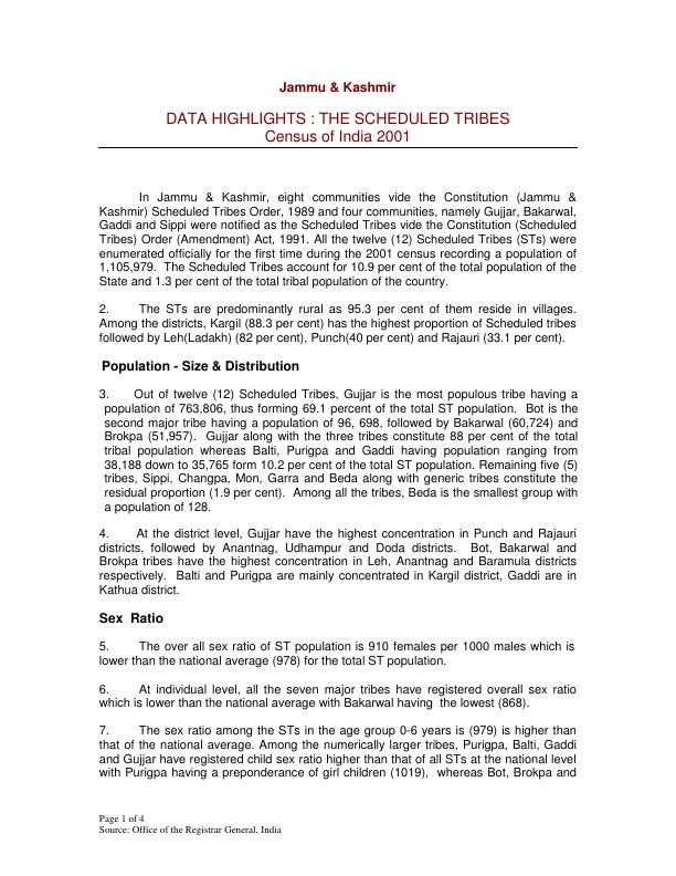 Census of India 2001, Data Highlights - The Scheduled Tribes, Jammu and Kashmir