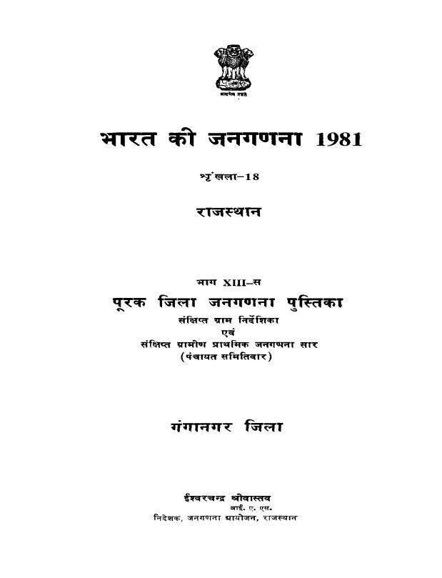 Complementary District Census Handbook, Gaganagar, Part XIII-S, Series-18, Rajasthan - Census 1981