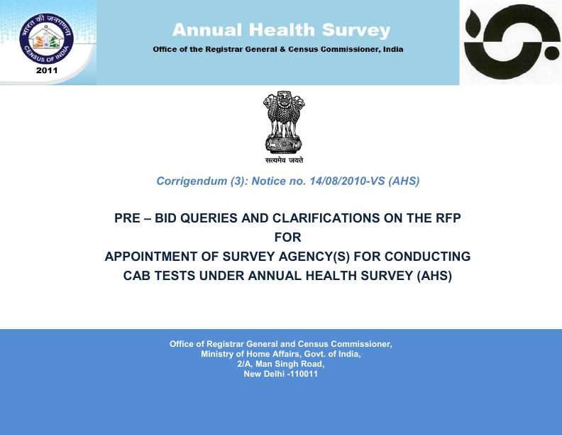 Corrigendum (3): Notice no. 14/08/2010-VS (AHS)-Pre Bid Qurries and clarifications on the RFP for Appointment of Survey Agency(s) for conducting CAB tests under Annual Health Survey (AHS) ( ORGI - New Delhi)
