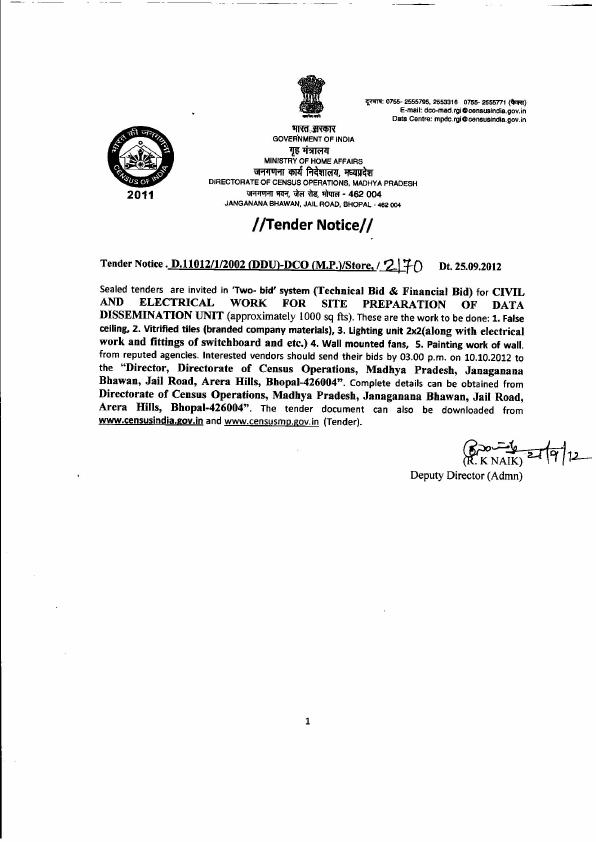 Tender for Civil and Electrical Work for site preparation for Data Dissemination Unit (DCO - Madhya Pradesh)