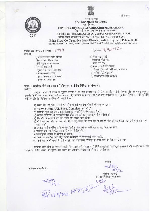 Tender for Office name Board and Fitting in Headquarter Building (DCO - Bihar)