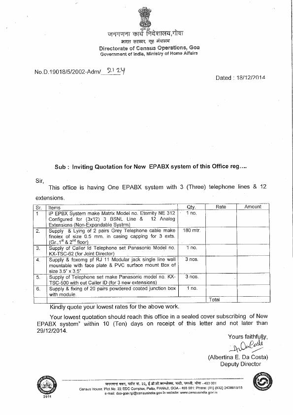 Tender for EPABX System [DCO - Goa]