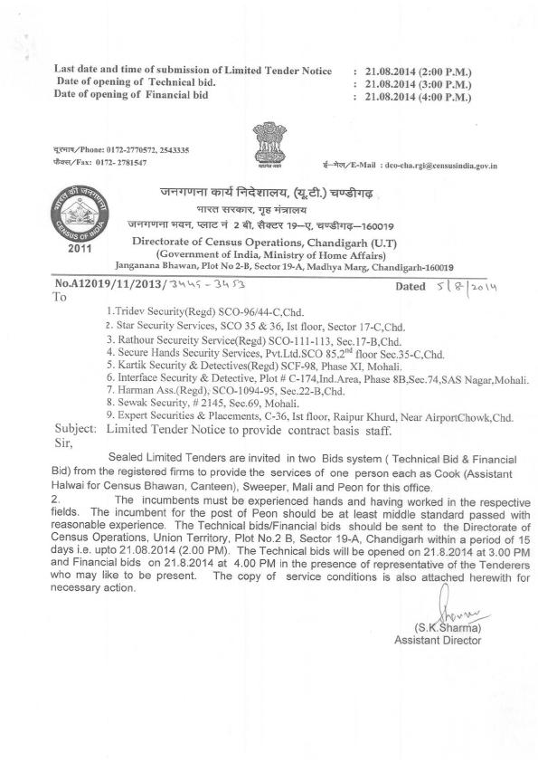 Tender Notice to Provide Contract Staff [DCO-Chandigarh]