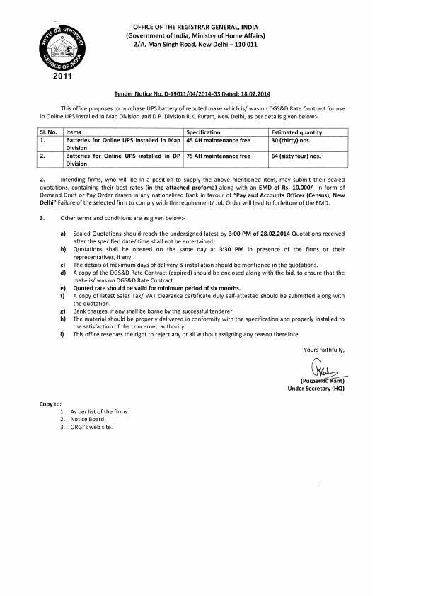 Tender for Purcurement of UPS Battery [ORGI-New Delhi]
