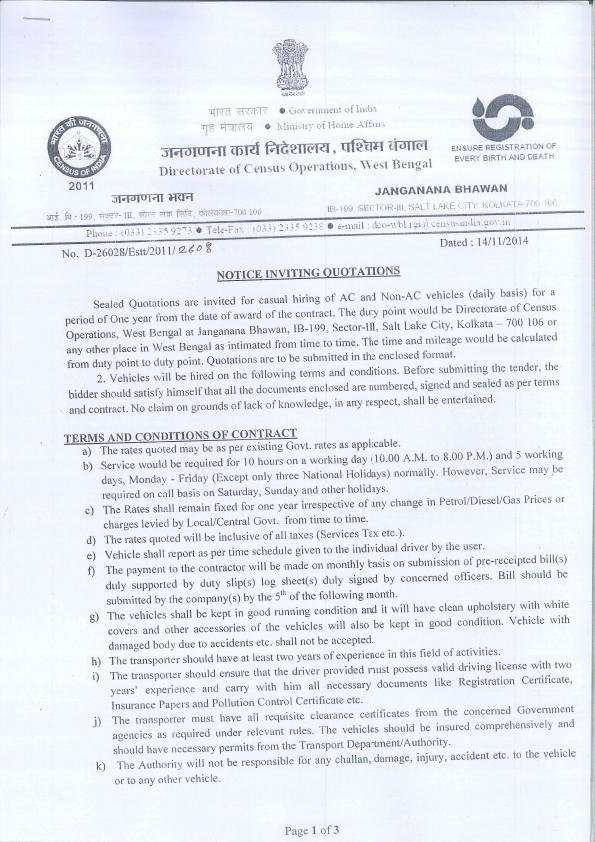 Tender for Hiring AC and Non Ac Vehicle [DCO - West Bengal]