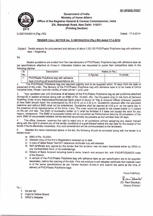 Revised Tender for procurement and delivery of about 1,00,100 PVC/Plastic Polythene bag with adhesive tape [ORGI-New Delhi]