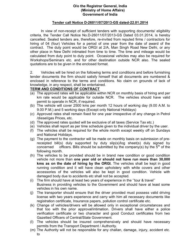 Re-tender for hiring of 04 (four) Vehicles [ORGI-New Delhi]
