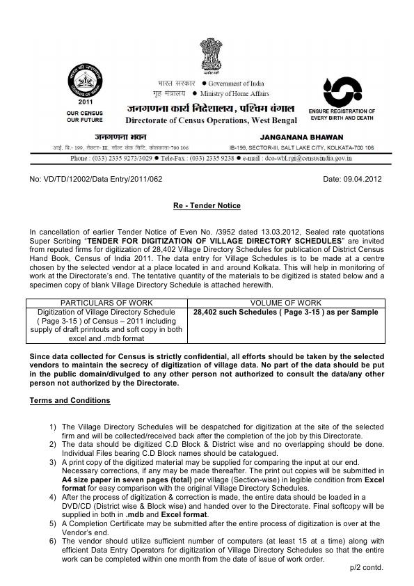 Re-Tender for Digitization of Village Directory Schedules (DCO -West Bengal)